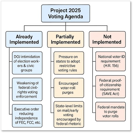The Brennan Center notes that the administration is already using executive actions and public threats to pressure states to adopt anti‑voter policies that are aligned with Project 2025.